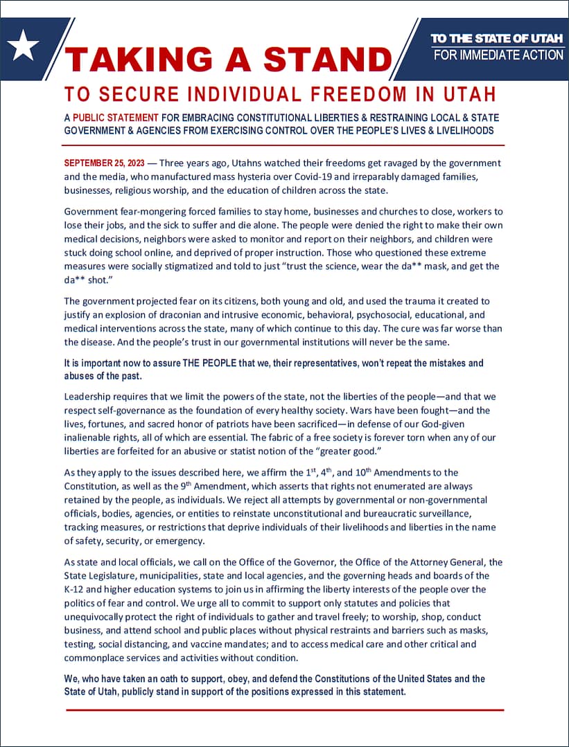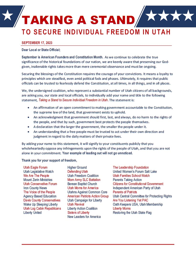 Utahns are asking their local and state officials to sign the statement below, Taking a Stand to Secure Individual Freedom in Utah